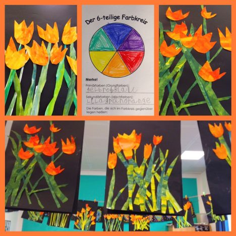 Wir haben im Kunstunterricht mit Wasserfarben gemalt. Zuerst lernten wir, dass man aus blau, rot und gelb alle Farben mischen kann. Diese Farben nennt man Grundfarben. Orange, grün und lila sind die…